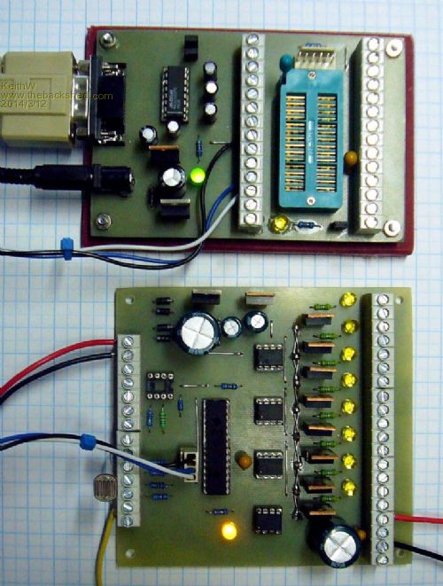 My photo shows the controller. The board was made using Diptrace Schematic and PCB Layout program and etched using the lazer printer toner transfer method via “Press-n-Peel”. I can confirm that Brother printer’s toner does not transfer near as well as my old Lexmark, which had a little toner left after a good shake of the cartridge. The smaller board at top is my Micromite programming and test tool with a 3 wire cable connecting its RS232 interface TTL output (2.2 volt clamped) to the Console pins on the Staircase Light Controller.