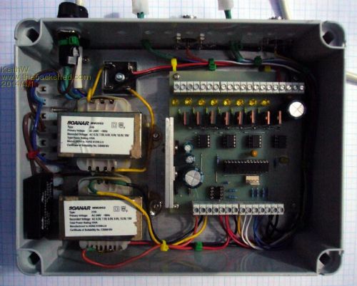 The project is installed and functioning. Two power transformers of the same type are used, for Light Supply and Controller. The Controller transformer is not optimum for power consumption but limited by availability. With taps for the voltages required I have 12 Volts D.C. un-regulated for Lights and 10.4 Volts D.C. regulated to 5 Volts and 3.3 Volts for the controller and sensors. When all lights are off a solid state relay removes power from the Light Supply Transformer; just enough current is drawn to hold on this relay (Jaycar SY-4080).
