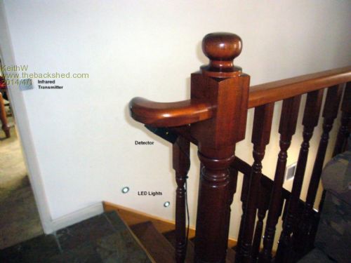 A photo shows the controller and transformers fitted in the case. The controller is mounted below a wide step located where the staircase turns near the bottom. I had cables already with connectors fitted that have a coax bundled with 4 light wires and of the correct length for the detectors. The coax is used for the LED current to prevent this signal from possibly leaking into the detector through its cable. A Detector Circuit diagram is here.