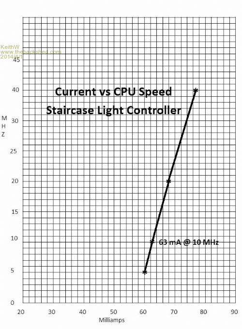 The second photo shows the top of the staircase with the infrared transmitter LED, the back of the detector box below the stair rail and the first LED wall lights. The photo is not erect but shows what is there. The graph shows Controller current vs. CPU clock speed including the drivers and infrared detectors and emitters. The LED Light Transformer current is zero when the solid state relay is off. The Micromite normally runs at 10 MHz equating to 63 milliamps @ 10.5 volts DC = 0.66 Watt. Allowing 1 watt gives 8.7 KWH PA. @ my 28c KWH peak = $2.43 PA for energy.