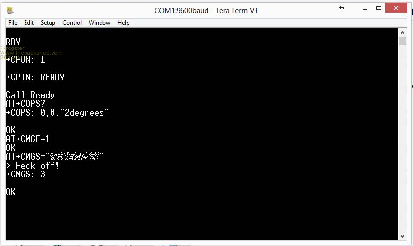 Fire it up with an active SIM card, then: AT+COPS? ...check current status of module - should show network name, and NET LED blinks once every three seconds. AT+CMGF=1 ...set module to text message mode. AT+CGMS="---cellphone number here---" ...Specify recipient cellphone number >This is a test message from the cellphone module. ...now send a CTRL+Z to end the message, and send it. Easy. Image of how simple it is to get things going: (this is from power-up)