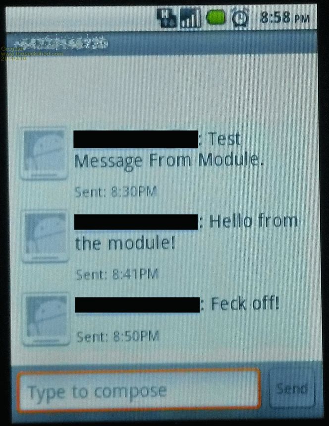 Cellphone number to send to, has been "Altered" by my picture software, for privacy... And the results on the cellphone...(number blacked out for privacy, but previous two messages shown)