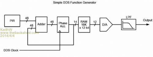 Direct Digital Synthesis is a method for creating any precise frequency at will between wide limits. DDS can be performed in software but not to radio frequencies. There are specialized chips. The chips use a fixed high frequency clock oscillator and are programmed with a 32 bit binary number via a serial interface (SPI). The output is typically a sine wave from an inbuilt A to D converter and Sine ROM table. Once set the output wave will continue without further CPU help until the frequency is changed. Basically DDS requires the repeated addition of a number to a binary accumulator every clock cycle, the most significant bits (14?) of the accumulator address a ROM phase addressed table of a Sine waveform, giving digital values that are converted to an analog voltage by a digital to analog converter. It is possible to use DDS techniques with the Micromite to generate low to medium frequencies, with an external A to D converter or by summing digital outputs with resistors. The waveform could be Sine or anything else repetitive from a table. It is possible to use less than the 32 to 48 accumulator bits detailed here.
