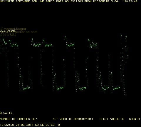 So I have given the Kansas City Tape Interface protocol a bit of a go. Have got some results....... Here is a screen shot of the demodulated sampled word generated by the micromite, transmitted over the UHF radio and analysed by the maximite.