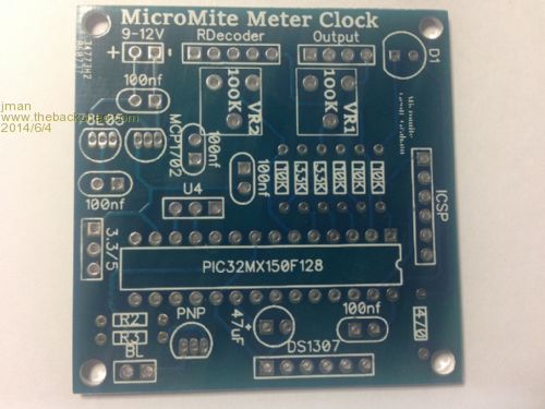 I have attached the circuit diagram, gerbers, meter scales and Micromite source should you wish to make your own. I have a couple of both types of PCB should anybody want one unfortunately the both contain an error that requires a track to be cut a wire link to be added. I will do this should anybody want one. Meters were sourced on Ebay http://www.ebay.com/itm/271365409590?var=570246171842&ssPage Name=STRK:MEWNX:IT&_trksid=p3984.m1439.l2649 RTC Module also sourced on Ebay http://www.ebay.com/itm/ARM-RTC-I2C-DS1307-AT24C32-Real-Time -Clock-Module-2-8CM-x-2-7CM-/301141332978?pt=LH_DefaultDomai n_0&hash=item461d6c13f2 Basic operation as below On first power up the meters will sweep from 0 to full twice If the DS1307 has not had the time set before the seconds LED (D1) will be on. To set the time press and hold the rotary decoder switch down for more than 3 seconds This will allow the time to be set using the rotary encoder a second press of the rotary encoder button will set the minutes a third press will save the time to the DS1307 and D1 will start to flash a 1 Hz A short press of the rotary encoder button will allow the backlight brightness to be set using the rotary encoder in this mode a second press saves the brightness level to eeprom. If the power is lost the clock will get the time from the DS1307 and the brightness level from the eeprom. The backlights are diffused LED’s of your colour choice these are fitted to the meters by drilling two appropriately sized holes (3mm or 5mm) at the bottom (two required) of the two meters. The meter scales were done using MeterBasic from here http://www.tonnesoftware.com/meterbasicdownload2.html The clock is powered by a DC source 7.5-12VDC 100ma is more than adequate U3 is to set theDS1307 modules supply voltage Jumper on 1-2 is for 5V and 2-3 is for 3.3v Most will require 5v Q1 is any general purpose PNP transistor The rotary encoder connections are (1-2 switch) ( 3 common 4 is left and 5 is right) Meter connections are 1-2 Minutes 3-4 Hours The current PWM percentage and time is updated once minute and can be monitored via the serial port If the brightness is adjusted this can also be monitored via the serial port. Regards Jman 2014-06-04_082300_MClock.zip |