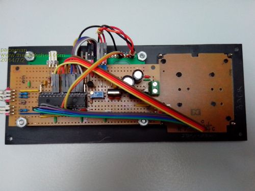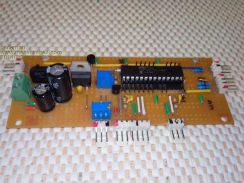 Even so, using a parallel 20x4 display and parallel 4x4 keypad I managed to also get the PWM display brightness control, lamp relay control (opto isolated), lamp 'ON' LED and a buzzer all controlled by the 24 pin chip and with two pins left over. Provision was also made on the board for the console Tx/Rx and ICSP connector (with some shared pins) but it all works. This is what the proto board looks like (actually it's half a proto board). I confess that I did use a couple of surface mounts bits to squeeze things in and the bottom as well as the top of the board was used, e.g. the 3.3v reg on the bottom.