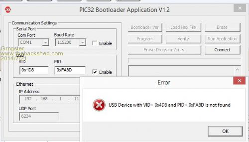 Still can't talk to the PIC32 though - is now reporting "Failed to get device ID" in red. There is 3.2v on the chip where it should be, 5v USB power for the moment. One USB port powers the VT100 PCB, the other port feeds the PK3.