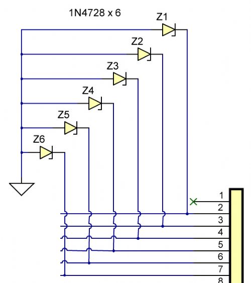 I wanted to protect the analog inputs of a uMite from the possibility of 12V DC being applied so I naturally designed the input to be ZENER protected (through a 1k Resistor) as shown here (the resistor is not shown), using 3v3 Zeners.