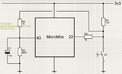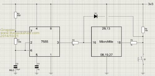 If S1 is pushed during a sleep cycle, D1 pulls the WAKEUP pin low and wakes the MicroMite allowing it to process the button press. During S1 presses while the MicroMite is awake, the 7555 is still running in the background, but as the MicroMite is now awake, it just ignores the 7555 output till the MicroMite is put back to sleep again.