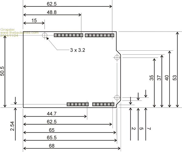 Also beware, as whilst it sounds a great idea, it has been done with the Duinomite range and Colour Maximite and the DonDuino Cross PCB and I really do not think that the Arduino footprint with any of these were popular and that very few were actually used with Arduino shields installed.. It wasn't seen as all that useful, for some reason or another. I, personally, do not agree with that but that is how the market saw it. Many criticisms were because of the speed of basic.. That `may' now be different with CFunctions but think carefully. Also the Arduino footprint is not all that user friendly IMHO it could be better to create your own bus and build add-on boards for it.. Anyway good luck PCBster Mick EDIT ** I see the distance between the rows is also different in your picture They have it as 50.5-2.54 or 47.96mm whereas it should be 1.9" or 48.26mm Mick Mick's uMite Stuff can be found >>> HERE (Kindly hosted by Dontronics) <<< |