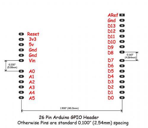 Grogster, Here are the correct dimensions for the Arduino connector.. Note that there is also an `incorrect' version that has the RHS gap as 0.15".. Whilst this is not quite the original spec they are close enough that they will work.. If you were going to do an Arduino style board I would use the correct 0.16" gap.