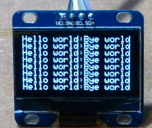 I received an SPI OLED display today so a minor mod to the Nokia drivers got that working, I've also converted the pstring routines to cFunctions as per the colour displays which has significantly speeded up text handling One thing to note, for reasons unknown 1.3" OLED displays (both i2c and SPI) need an offset of 2 applied to the column address in the refresh routine. I've added this as an optional parameter to the "Init" routines. 0.96" displays don't need this and it defaults to 0. I find the 1.3" displays, as in the picture, much more usable than the 0.96" ones, although more expensive. For my ageing eyes the normal size text on the 0.96" is only marginally readable. Search for I2C OLED, SSI OLED, with or without 1.3" to find the displays on ebay. The ZIP contains library files for both the i2c and SPI variants, together with the common cFunction source. The library files are in the format prepared by G8JCF. 2014-12-15_184009_OLED-ssd1306.zip |
