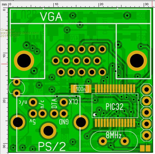 I did not really NEED a VT100 this small, it was just an excuse for me to play with multi-layer. And Shenzhen's PCB prices are just too good for me to not have a play with multi-layer - US$22.90 for ten of these four-layer boards. Having set the PCB size, the mission was "Can I squeeze it all in there?" You would have no hope of doing this module, this small, without going multilayer, I would think.(prove me wrong though!) The PCB size came about based on the VGA socket footprint. It was 31mm wide, so add 1mm and make it square - that was how I came up with the 32mm square size. Smoke makes things work. When the smoke gets out, it stops! |