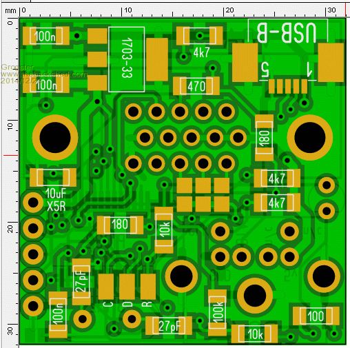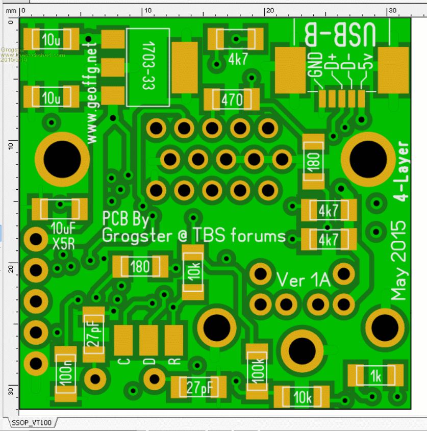 Playing around with multi-layer board designs now, and this one is four-layer. This board is only 32mm square, but contains the full VT100, including on-board VGA socket, PS/2 socket for the keyboard, USB connector, 3v3 regulator, activity LED, colour select pads, composite video out, regulated 3v3 out, RXD input protection resistors and three pads to allow you to program the firmware into the chip in the first place. These are just solder pads, cos once you have the firmware in there, any updates can be via USB, so you should only ever need to do this once in an ideal world. Power for this module is via the USB cable. There is no provision for external power, but with the plethora of cheap USB charger plug-packs that can be had(often fitted with a USB A type socket), one of these and a USB cable and you have your "External" power. TOP (visual layer only):