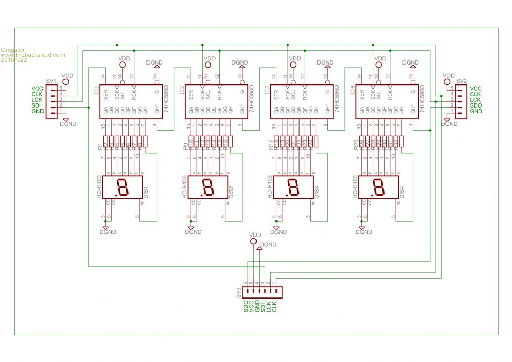 From what I can see, all 595's are daisy-chained together(you are right!), so to show any four digits, I need to clock 32 bits to the display, then clock the RCK line, which should pass that data through to the segments, lighting up what is needed. While clocking the 32-bit data to the display, I get the impression that the display will not change, until you clock the RCK line. Each time you do that, whatever bits are loaded into the registers will be reflected in the output - in this case, LED segments. Smoke makes things work. When the smoke gets out, it stops! |