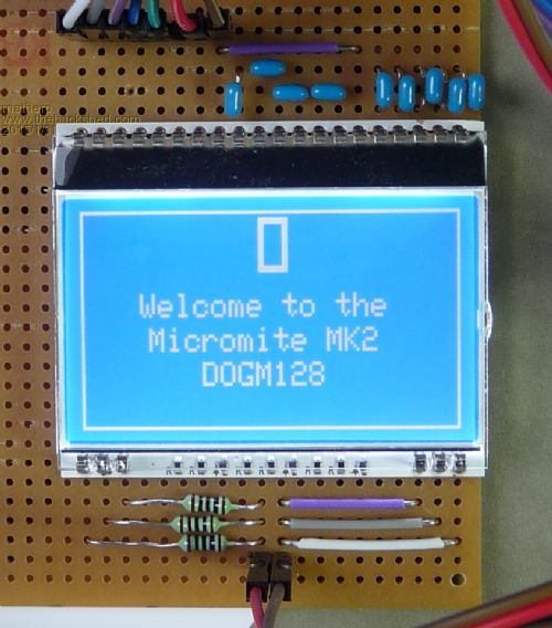 I tried this with a Zolen ZLE12864B which is similar to the DogM128. The ZLE12864B uses the ST7565P controller rather than the "R" version. It ran but the contrast was poor and the screen lost the 8 left bits so when the Hello World screen came up I saw ello World. The ZLE12864B may require a few tweaks to the code to get it working. |