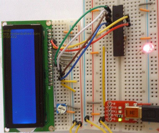 On powerup the LCD shows blue, with one line of 16 dark rectangles. None on line 2.