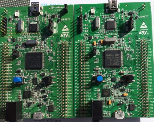 Older Discovery versions MB997A and B tantalum capacitors on positions C33 & C36 while latest board MB997C uses ceramic capacitors. As the B version of board was sitting in a drawer since 2011 the tantalum capacitors ESR went higher (3.9Ohm) when a fresh capacitor has ~1.1Ohm. I fixed board temporarily with replacement C33 and C36 for tantalum capacitors with low ESR and I purchased X7 2.2uF 1206 ceramic capacitors on Ebay.