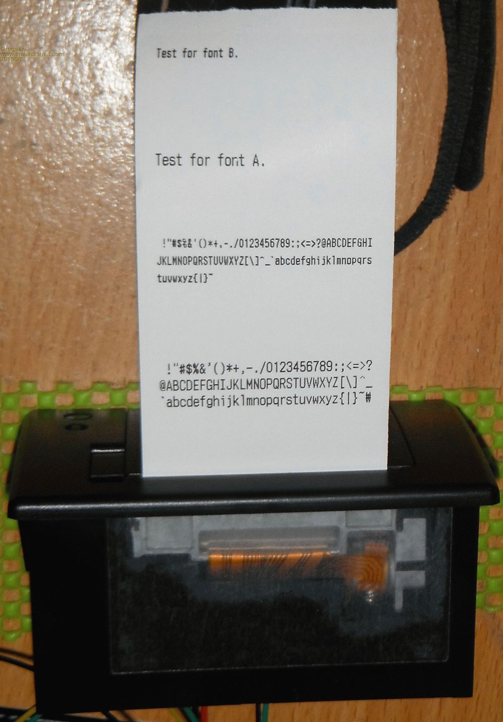 Nice one G. I see under your Chinese message to me that FontB is 41 characters per line (if my eyes are correct) and a leading space (or two). Is there another font offering 80(ish) characters per line? This is just about readable in the photo but what is it like to read when it is front of your eyes (i.e. physically in your hands)? Whilst on FleaBay did you see any wider thermal printers? Sorry for all the Qs but have a requirement for something . . . . WW |