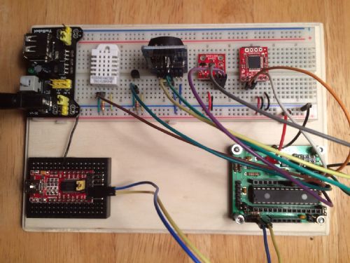 The following is a picture of the data logger. The 3.3 volt power supply, sensors and OpenLog are located on the large breadboard. From left to right; the DHT22, the DS18B0, the RTC, the BMP180 and the OpenLog device.