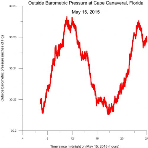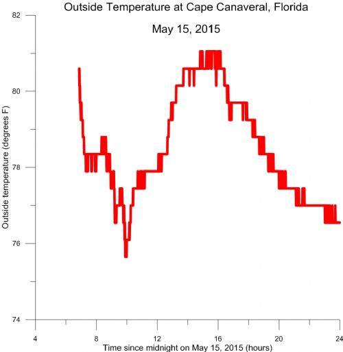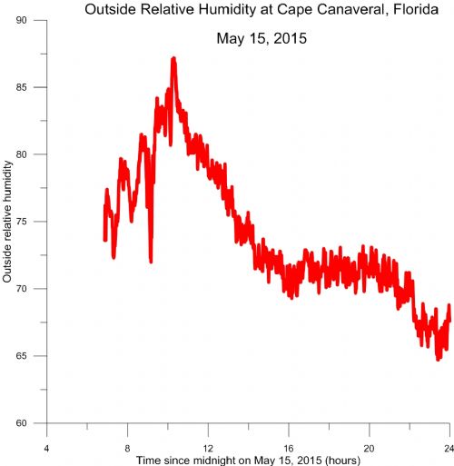 Here are several plots created using data from the data logger. They illustrate outdoor atmospheric conditions yesterday, May 15, 2015, at Cape Canaveral, Florida.