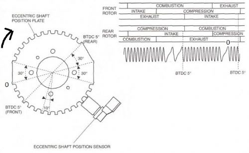 Everything will be based on the timing of the Crank Sensor (36-2-2-2). If this can be done, the rest should slowly fall into place. The imagine below is for a Rotary Engine. I have the hardware done that converts the AC sine wave into a nice digital signal. The fastest the engine will spin is 10,000rpm (166.6Hz)