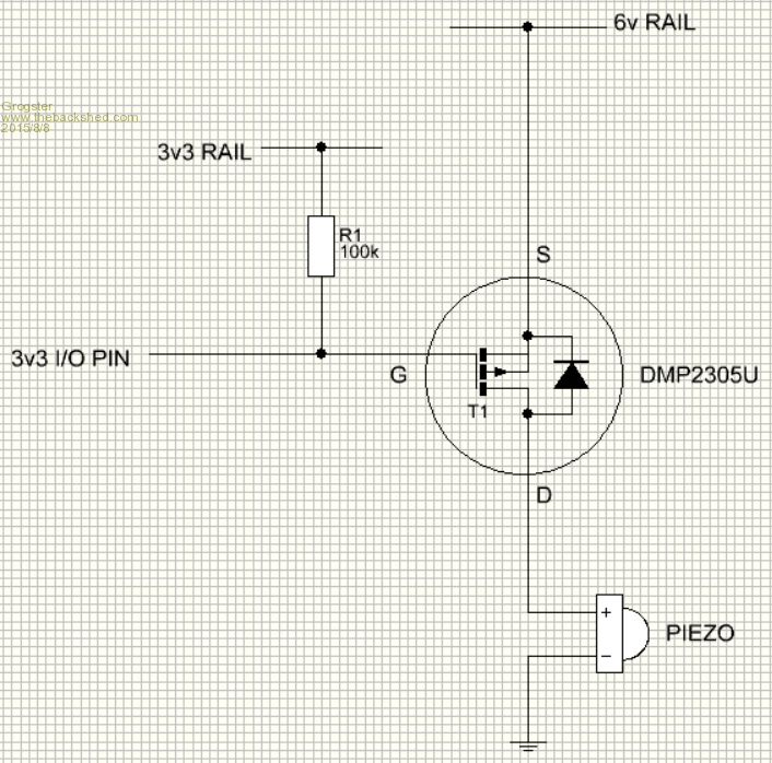 the P-channel MOSFET starts to turn on when Vgs exceeds about a volt. in this case, you permanently have at least 2.7v (6 - 3.3) applied to the gate, therefore the MOSFET is permanently turned on. you can only use a P-channel MOSFET in this configuration IF you have your pullup running to the same place as the source ("6v RAIL") AND you use an open-collector output to control the gate. an open collector output from a maximite will not do, as the output will still not be able to rise above 3.9v (3.3 + 0.6) due to the protection diodes on the pin. you therefore need to use a second transistor, an NPN bipolar, to control the gate. the base of the NPN transistor should have a 47k or thereabouts resistor in series with it. when the maximite's output pin is low, the NPN transistor will be turned off (no base current), allowing the 100k resistor to pull the MPSFET's gate to the same voltage as the source. the MOSFET will therefore be turned off. when the maximite's output pin is high, current will flow through the 47k resistor into the NPN transistor's base, turning on the NPN transistor. this will cause a difference of about 6v to exist between gate and source of the MOSFET, thurning it on and causing the buzzer to sound. cheers, rob :-) |