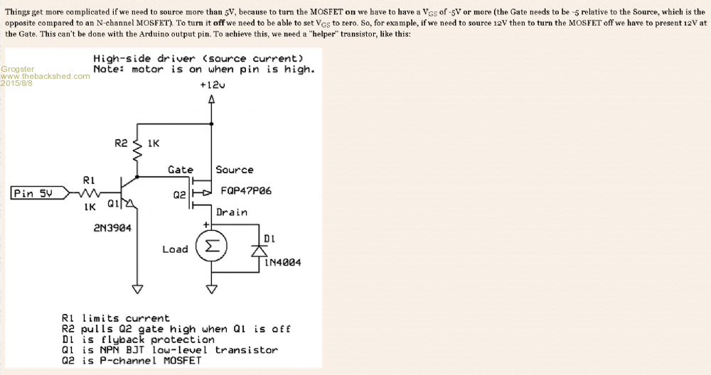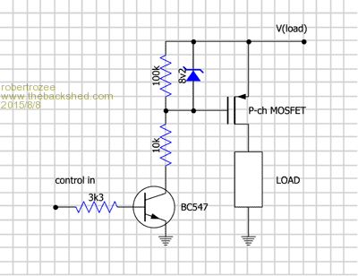 you do need to be wary of the maximum Vgs of the MOSFET. for the Si4838DY shown, this appears to be 8 volts. so the above circuit, if using a 12v supply, will be operating outside of the MOSFET's absolute maximum ratings. to solve this problem, you can either pick a MOSFET with a suitably high Vgs(max), or add a zener diode between gate and source and add a suitable series resistor to the gate/zener. at the same time, i'd be inclined to consider using a MOSFET that is happy being placed in the +ve rail; modern P-channel MOSFETs have pretty good specs and will be quite adequate in most hobbyist applications. cheers, rob :-) |