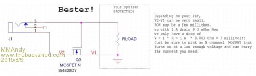 Another use for a mosfet ... For those wanting a reverse polarity protection this circuit will do it. It could be used on the MM+ Explore 64 stamp module on a breadboard to prevent reverse polarity and yet only have a few millivolts of drop! There are 3 pins, the GATE, SOURCE, and DRAIN, labeled G, S and D. you connect the * GATE to the + input voltage (pin 3 of the power jack in my diagram). * DRAIN to the - input voltage (pin 1 of the power jack in my diagram) * SOURCE to the GND of your circuit. http://www.instructables.com/id/Reverse-polarity-protection-for-your-circuit-with/