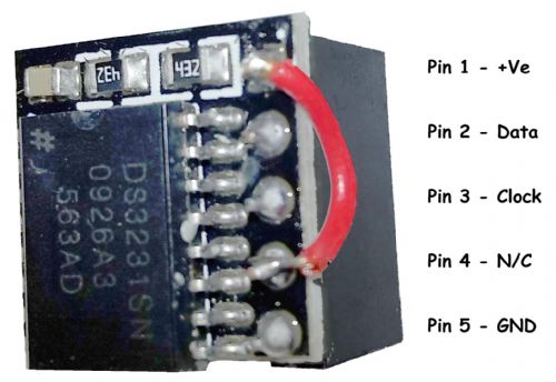 All that is needed to plug into my `Mik-Standard' I2C bus is to run a short wire (red in the following pictures) from Pin 1 to Pin 4 of the 5 pin female header and offset the module when you plug it into the I2C 4pin header so that pin 1 is hanging over as shown below.