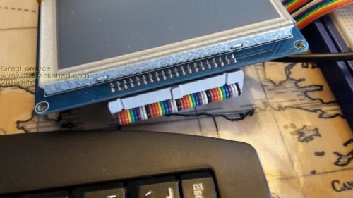 Make sure the cable is connected with the tab facing out as shown. Because the 5v0 and 3v3 pins are tied together if you try and connect it with the cable the other way round you will short 3v3 to ground! This way it doesn't matter about the tied pins becasue they are connected to unused pins on the ssd1963.