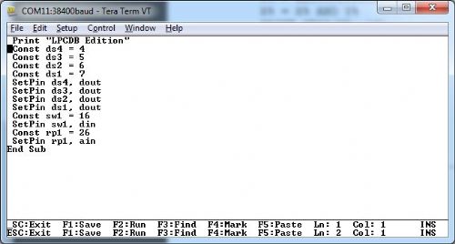 Tried this to get around the scoping issue: [code] ' LPCDB Include file Sub mm.startup Print "LPCDB Edition" setpin 4, dout setpin 5, dout setpin 6, dout setpin 7, dout setpin 16, din setpin 26, ain End Sub Const ds4 = 4 Const ds3 = 5 Const ds2 = 6 Const ds1 = 7 Const sw1 = 16 Const rp1 = 26 [/code] But the result is the same, even if I put the constants before or after mm.startup Cheers Chris http://caroper.blogspot.com/ |