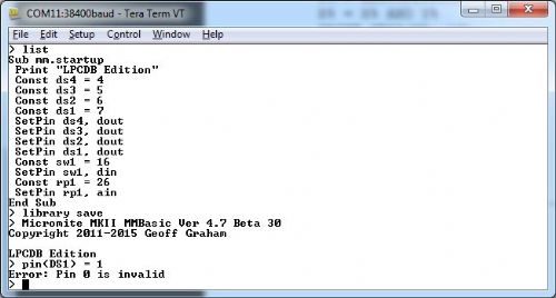 [code] > XMODEM RECEIVE Saved 226 bytes > library save > Micromite MKII MMBasic Ver 4.7 Beta 30 Copyright 2011-2015 Geoff Graham LPCDB Edition > ? ds1 0 > [/code] [quote] Also - should be pin(ds1)=1 i.e. normal brackets!