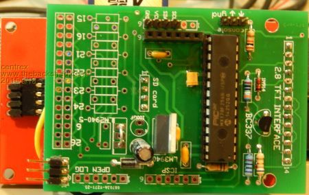 The board is a modified version of the modified BP170 of a couple of moths ago. It has 4 pads for connection to the sd port on the display board. The pin allocations have been changed from the origonal to allow the connection of the sd card. Unfortunately because all the pwm pins are used for the display and the sd card there is no brightness control available for the display only on/off.