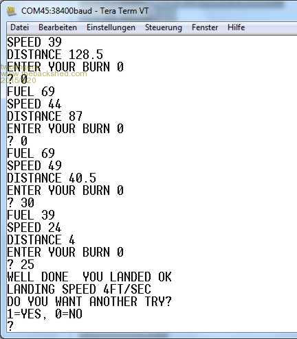 For some serious brown pants, try this sequence: (0,0,0,0,0,0,0,15,75) - check the number of zero burns, might be one more or less. Total fuel used: 90 lbs. ---------------- I might actually remember this game as a kid, from Creative Computing or some such. It is interesting to ponder this now and wonder why the computer wasn't used to solve the problem, instead of presenting it. Not that that has changed much over the years - only the graphics and sound have gotten better. I've got to dig out "Hunt the Wumpus"... Visit Vegipete's *Mite Library for cool programs. |