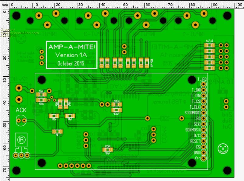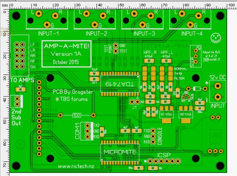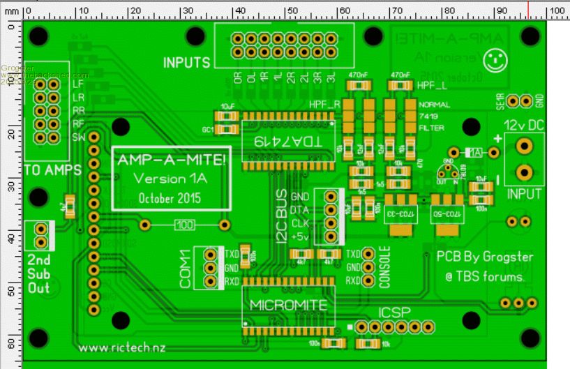 @ Jim - I am using the MIX pin as a 2nd sub out at this stage, but you can configure that pin to be an input if you like, all via I2C. When used as a mixer input, it would seem that you can feed audio in here, and mix it to the FRONT set of speaker(but not the rear) all under I2C control. The PCB could cater for either or - just change the 4u7 cap for a 100n to make '2nd Sub Out' into the MIX input.