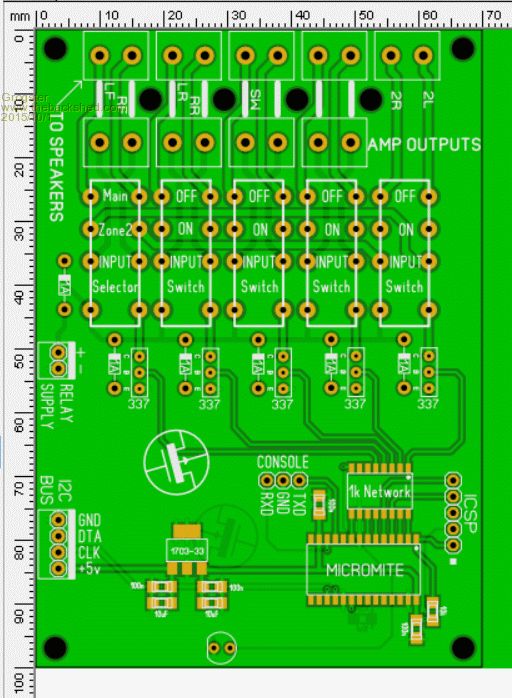 I have designed a speaker relay board, also controlled by a MM. This board serves a couple of functions: (1) speaker de-thump relays as all speakers are off by default, and (2) speaker switching and zone selector. All of these relays can be turned off and on via the main pre-amp's MM I2C Master and the GUI SWITCH controls, which allows for full control of which speaker sets you want on or off. At power-up, this board will enable all four speakers, the sub and select zone1 for the front speakers.