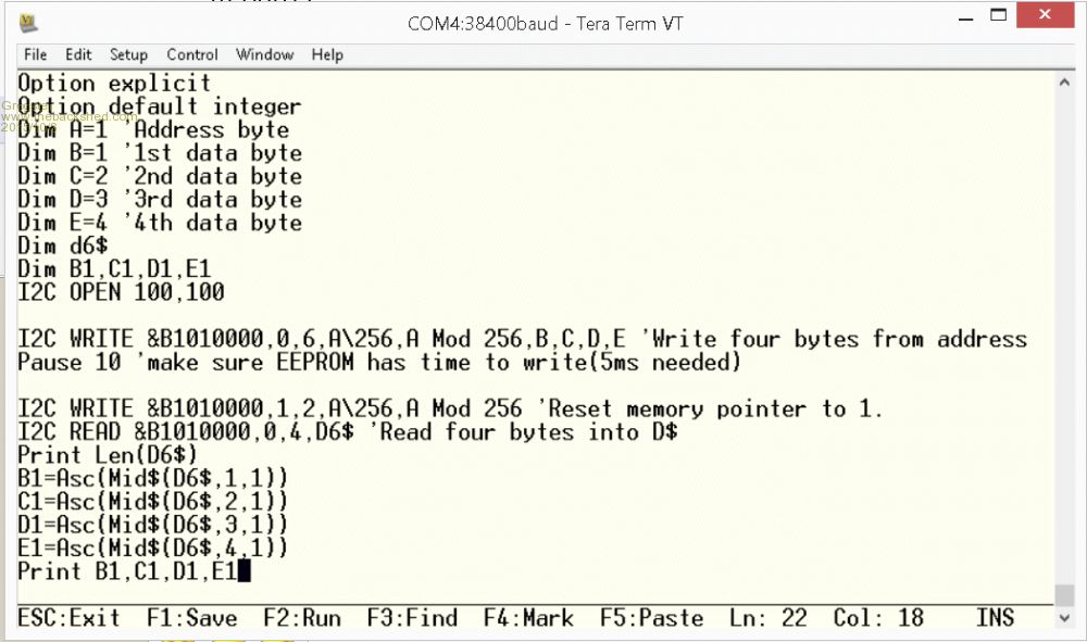 I2C WRITE &B1010111,0,6,A\256,A Mod 256,B,C,D,E 'Write four bytes from address 1