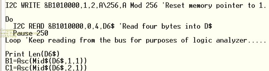 I2C WRITE &B1010000,1,2,A\256,A Mod 256 'Reset memory pointer to 1.