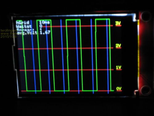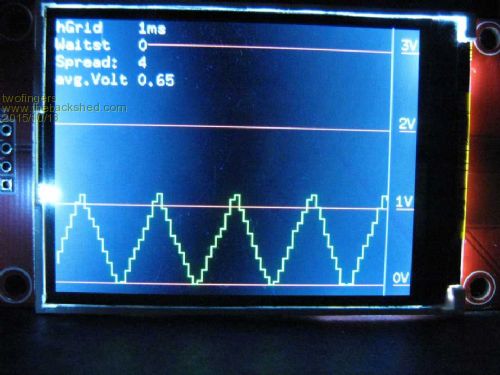 ' MM.DSO a simple Digital Storage Oscilloscope (kind of) ' this is a quick & dirty Version 0.09 beta ' tested for frequencies from 1 to 100 Hz (or more) ' ' System: MMBasic 4.7 Micromite 2 ' (MX170/28, Micks BP170 + 2.4" TFT 240x320) ' by twofingers 10-2015 at TBS ' ' Used keys (serial): ' TAB switches gain (3V/30V) vertical res. ' I enable/disable info text ' 1-4 Spread increase/decrease vertical ' +- Waitstates increase/decrease ' >< increase/decrease hor. grid ' q quits ' ' Used PINs (MX170/28): ' 23 as Input ' 26 as Output for Demosignals (PWM, SERVO or DOUT) '******************************************************* ' This code may be freely distributed and changed. ' Provided AS IS without any warranty. ' Use it at your own risk. All information is provided for ' educational purposes only! ' ------------------------------------------------------ ' ++++++ Credit to Geoff for his great MMBasic ++++++ '******************************************************* Option explicit CPU 48 Const border_r=25 ' voltage scala Const screenwidth=MM.HRes-border_r ' usable screenwidth Dim float p(screenwidth),y,y0,F,tm,w,x_base,vsum,VCorrect=1 'float is faster than int Dim integer i, x=0 'x=hor_pos Dim integer baseline, waitstates, gain=70,level=0,hGrid=10, Info=1 On KEY Keyhandler Colour RGB(GREEN), RGB(BLACK) CLS SetPin 23,AIN 'Input '************* Demo Signals ************** 'SetPin 26,DOUT 'Output signal generator 'SetTick 1000,SigGen ' or PWM 2,50,50 ' or 'Servo 2,18 '****************************************** baseline=MM.VRes-10 F=1 'hor spread default = 1 waitstates=0: 'slow sample speed down, default = 0 SetupScreen y0=baseline Do If x=0 Then If waitstates Then ' To be as fast as possible, we use 2 Sample Loops tm=Timer For i = 1 To screenwidth:p(i)=Pin(23):wait:Next Else tm=Timer For i = 1 To screenwidth:p(i)=Pin(23):Next EndIf tm=Timer-tm 'Print tm:End x_base=screenwidth/tm '4,6s/ms Box 0, 0,screenwidth, MM.VRes, 0,0,0 'CLS SetupScreen For i = Hgrid*F To tm Step Hgrid*F ' 10=1/100sec = 1000ms/10 Line x_base*i, 0,x_base*i, MM.VRes, , RGB(blue) Next i vsum=0:For i = 1 To screenwidth:vsum=vsum+p(i) :Next 'For i = 1 To screenwidth: Print p(i):Next EndIf x=x+1 If (x+border_r)*F>=MM.HRes*F Then 'new screen Pause 400 x=0 EndIf y=baseline-p(x/F)*gain If x>1 Then Line x,y0,x,y y0=y Loop Sub SigGen 'settick interrupt If level = 0 Then level = 1 Else level = 0 Pin(26)=level End Sub Sub SetupScreen Local scalefactor=70 Local integer sc0=MM.VRes-baseline, sc1=sc0+scalefactor Local integer sc2=sc0+scalefactor*2,sc3=sc0+scalefactor*3 Local string volt(4,1) = (""," 0V"," 1V"," 2V "," 3V",""," 0V","10V","20V","30V") LENGTH 3 Local integer g=(gain=7) Line 0, MM.VRes-sc0,MM.HRes, MM.VRes-sc0, , RGB(red) '0V line Line 0, MM.VRes-sc1,MM.HRes, MM.VRes-sc1, , RGB(red) ' Line 0, MM.VRes-sc2,MM.HRes, MM.VRes-sc2, , RGB(red) ' Line 0, MM.VRes-sc3,MM.HRes, MM.VRes-sc3, , RGB(red) '3/30V line Text MM.HRes-border_r, MM.VRes-sc0-13, volt(1,g), , 2,1,RGB(YELLOW) Text MM.HRes-border_r, MM.VRes-sc1-13, volt(2,g), , 2,1,RGB(YELLOW) Text MM.HRes-border_r, MM.VRes-sc2-13, volt(3,g), , 2,1,RGB(YELLOW) Text MM.HRes-border_r, MM.VRes-sc3-13, volt(4,g), , 2,1,RGB(YELLOW) If Info Then Text 0,0, "hGrid "+Str$(Hgrid)+"ms", , 2,1,RGB(WHITE) Text 0,12, "Waitst "+Str$(Waitstates), , 2,1,RGB(WHITE) Text 0,24, "Spread: "+Str$(F), , 2,1,RGB(WHITE) Text 0,32, "avg.Volt"+Str$(vsum/screenwidth,2,2), , 2,1,RGB(WHITE) EndIf End Sub Sub wait For w=1 To waitstates:Next End Sub Sub keyhandler 'kbd interrupt handler Local key$ key$=Inkey$ Do While Inkey$=" ":Loop Select Case key$ Case "1" To "4" F=Val(key$) Case "I","i" Info=Not Info Case "+" If Waitstates=0 Then Waitstates=1 Else If Waitstates<10000 Then Waitstates=Waitstates*10 EndIf Case "-" If Waitstates=1 Then Waitstates=0 Else If Waitstates>0 Then Waitstates=Waitstates/10 EndIf Case ">" If Hgrid<10000 Then Hgrid=Hgrid*10 Case "<" If Hgrid>10 Then Hgrid=Hgrid/10 Case Chr$(9) If gain = 70 Then gain=7 Else gain=70 EndIf Case "q" end End Select End Sub End This is useful to inspect servo and/or slow PWM signals. One sample cycle (295 samples) takes ~64ms. I guess a CFunction could improve the sample speed by a factor of 10-20x. e.g. long long readADCtoArray(float array[], long long *elements, long long *delay, long long *pin)