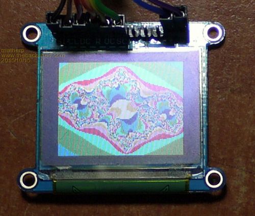 Another loadable driver, this time for the SSD1351 colour OLED. Seen here displaying Geoff's Julia. Support for this display was originally requested by WhiteWizzard The picture doesn't do the display justice. The colour OLED gives a very bright and vibrant display. This version is again MX170 only. MX470 version by request. sub mm.startup dim myaddr%=peek(cfunaddr SSD1351) dim i%=SSD1351(myaddr%,15,30,11,96,1)'Address of CFunction, DCpin, RSTpin, CSpin, vertical resolution, orientation end sub ' ' File SSD1351.bas written 23-Sep-2015 10:05:39 ' CFunction SSD1351 00000062 'writeData 27BDFFE0 AFBF001C AFB10018 AFB00014 309100FF 3C109D00 8E030090 8E02001C 8064002C 0040F809 24050006 8E030090 8E02001C 8064002D 0040F809 24050005 3C02BF80 AC515820 3C03BF80 8C625810 30420080 1040FFFD 3C02BF80 8C425820 3C029D00 8C430090 8C42001C 8064002D 0040F809 24050006 8FBF001C 8FB10018 8FB00014 03E00008 27BD0020 'writeCommand 27BDFFE0 AFBF001C AFB10018 AFB00014 309100FF 3C109D00 8E030090 8E02001C 8064002C 0040F809 24050005 8E030090 8E02001C 8064002D 0040F809 24050005 3C02BF80 AC515820 3C03BF80 8C625810 30420080 1040FFFD 3C02BF80 8C425820 3C029D00 8C430090 8C42001C 8064002D 0040F809 24050006 8FBF001C 8FB10018 8FB00014 03E00008 27BD0020 'spi_write_cd 27BDFFD8 AFBF0024 AFB10020 AFB0001C AFA60030 AFA70034 00A08821 27A20030 AFA20010 308400FF 0411FFD2 00000000 1A20000A 00008021 8FA20010 24430004 AFA30010 90440000 0411FFA7 00000000 26100001 1611FFF9 8FA20010 8FBF0024 8FB10020 8FB0001C 03E00008 27BD0028 'main 27BDFFC8 AFBF0034 AFB60030 AFB5002C AFB40028 AFB30024 AFB20020 AFB1001C AFB00018 00808821 8FA20048 8C530000 3C109D00 8E020090 8CC30000 A043002E 8E020090 8CA30000 A043002C 8E020090 8CE30000 A043002D 8E020090 8FA3004C 8C630000 A0430015 8E020090 A053003C 8E030090 8E020010 8064002E 24050008 0040F809 00003021 8E030090 8E020010 8064002E 24050065 0040F809 00003021 8E030090 8E02001C 8064002E 0040F809 24050006 8E030090 8E020010 8064002C 24050008 0040F809 00003021 8E030090 8E020010 8064002C 24050065 0040F809 00003021 8E030090 8E02001C 8064002C 0040F809 24050006 8E030090 8E020010 8064002D 24050008 0040F809 00003021 8E030090 8E020010 8064002D 24050065 0040F809 00003021 8E030090 8E02001C 8064002D 0040F809 24050006 3C02BF81 8C44F220 7C84D800 3C020661 3442A053 1082000B 24030050 3C02BF81 8C43F220 7C63D800 3C020660 3442A053 00621826 24020050 2404000C 0083100B 00401821 3C029D00 8C420088 00621821 8C640000 24030064 54830007 00009021 3C03BF80 8C725830 8C745800 8C765840 10000003 3C03BF81 0000A021 3C03BF81 8C65F220 7CA5D800 3C040661 3484A053 10A4000B 24030050 3C03BF81 8C64F220 7C84D800 3C030660 3463A053 00831826 24040050 2405000C 00A3200B 00801821 00621021 8C430000 24020065 10620084 3C029D00 8C420010 3C03BF81 8C65F220 7CA5D800 3C030661 3463A053 10A3000B 24040014 3C03BF81 8C64F220 7C84D800 3C030660 3463A053 00832026 24030014 24050003 00A4180B 00602021 24050008 0040F809 00003021 3C029D00 8C420010 3C03BF81 8C65F220 7CA5D800 3C030661 3463A053 10A3000B 24040014 3C03BF81 8C64F220 7C84D800 3C030660 3463A053 00832026 24030014 24050003 00A4180B 00602021 24050065 0040F809 00003021 3C029D00 8C420010 3C03BF81 8C65F220 7CA5D800 3C030661 3463A053 10A3000B 24040029 3C03BF81 8C64F220 7C84D800 3C030660 3463A053 00832026 24030029 2405000E 00A4180B 00602021 24050002 0040F809 00003021 3C029D00 8C420010 3C03BF81 8C65F220 7CA5D800 3C030661 3463A053 10A3000B 24040029 3C03BF81 8C64F220 7C84D800 3C030660 3463A053 00832026 24030029 2405000E 00A4180B 00602021 24050065 0040F809 00003021 3C029D00 8C420010 3C03BF81 8C65F220 7CA5D800 3C030661 3463A053 10A3000B 2404000E 3C03BF81 8C64F220 7C84D800 3C030660 3463A053 00832026 2403000E 24050019 00A4180B 00602021 24050008 0040F809 00003021 3C029D00 8C420010 3C03BF81 8C65F220 7CA5D800 3C030661 3463A053 10A3000B 2404000E 3C03BF81 8C64F220 7C84D800 3C030660 3463A053 00832026 2403000E 24050019 00A4180B 00602021 24050065 0040F809 00003021 3C02BF81 8C44FA84 24030001 7C641804 AC44FA84 3C02BF81 8C44FB04 24050003 7CA41804 AC44FB04 3C02BF80 34048060 AC445800 AC435830 24030C00 AC435840 56400005 3C029D00 8C525830 8C545800 8C565840 3C029D00 24420188 3C159D00 26B50AF0 02A2182B 10600004 02A2A823 8E230000 10000003 02A3A821 8E230000 02A3A821 3C039D00 24630D1C 0062202B 10800004 00621023 8E240000 10000003 00448821 8E240000 00448821 3C109D00 8E030090 8E02001C 8064002E 0040F809 24050006 8E020004 0040F809 24042710 8E030090 8E02001C 8064002E 0040F809 24050005 8E020004 0040F809 24042710 8E030090 8E02001C 8064002E 0040F809 24050006 8E020004 0040F809 24042710 240400FD 24050001 24060012 0411FE95 00000000 240400FD 24050001 240600B1 0411FE90 00000000 240400AE 0411FE6A 00000000 240400B3 24050001 240600F1 0411FE88 00000000 240400CA 24050001 2406007F 0411FE83 00000000 240400A0 24050001 24060074 0411FE7E 00000000 24040015 24050002 00003021 2407007F 0411FE78 00000000 24040075 24050002 00003021 2407007F 0411FE72 00000000 240400A2 24050001 00003021 0411FE6D 00000000 240400B5 24050001 00003021 0411FE68 00000000 240400AB 24050001 24060001 0411FE63 00000000 240400B1 24050001 24060032 0411FE5E 00000000 240400BE 24050001 24060005 0411FE59 00000000 240400A6 0411FE33 00000000 240200C8 AFA20010 240400C1 24050003 240600C8 24070080 0411FE4E 00000000 240400C7 24050001 2406000F 0411FE49 00000000 24020055 AFA20010 240400B4 24050003 240600A0 240700B5 0411FE41 00000000 240400B6 24050001 24060001 0411FE3C 00000000 240400AF 0411FE16 00000000 2404005C 0411FE13 00000000 8E020090 90420015 30420001 10400007 3C029D00 8C430094 24040080 AC640000 8C420098 10000006 AC530000 8C430098 24040080 AC640000 8C420094 AC530000 3C029D00 8C430048 AC750000 8C43004C AC710000 8C430048 8C440094 8C860000 8C420098 8C470000 AFA00010 8C620000 00002021 00002821 24C6FFFF 0040F809 24E7FFFF 3C02BF80 AC525830 AC545800 AC565840 00001021 00001821 8FBF0034 8FB60030 8FB5002C 8FB40028 8FB30024 8FB20020 8FB1001C 8FB00018 03E00008 27BD0038 'defineregion 27BDFFD0 AFBF002C AFB50028 AFB40024 AFB30020 AFB2001C AFB10018 AFB00014 0080A021 00A09821 00C0A821 3C029D00 8C420090 8050003C 80420015 24030001 14430012 00E0902