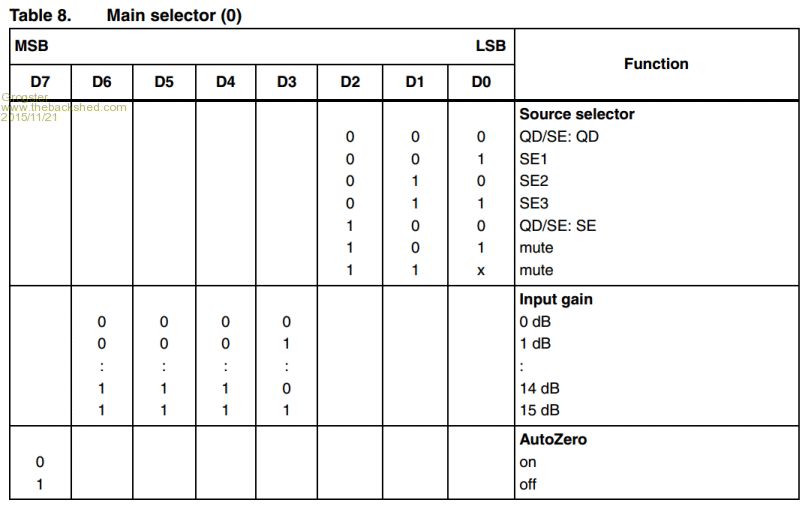 In the stereo project that jman is helping me with, he wrote most of the code to manipulate the bits of the data byte for any address that you send off to the pre-amp chip, but I would like to understand how this actually works. Take the following snippet from the manual: