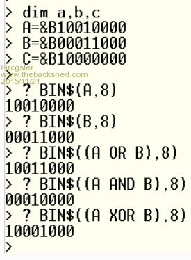 When working with bits it is best to use BIN as you are doing. You need to understand the basic BIT operations - AND OR and XOR AND, if both bits are set (1), the result is 1 OR if either bit is set, the result is 1 XOR if one bit is set (1) and the other not set (0), the result is 1 There is no 'carry' and the operation is done on each bit independently. try this code: A=&B10010000 B=&B00011000 C=&B01000000 PRINT BIN$(a,8) PRINT BIN$(b,8) PRINT BIN$(c,8) PRINT "" PRINT BIN$((a OR b),8) PRINT BIN$((a AND b),8) PRINT BIN$((a XOR b),8) PRINT "" PRINT BIN$((a OR b OR c),8) PRINT BIN$((a AND b AND c),8) PRINT BIN$((a XOR b XOR c),8) PRINT "" PRINT BIN$(((a AND b) XOR c),8) PRINT BIN$((a XOR (b XOR c)),8) All the BIN$ stuff just makes the code harder to follow but is need to see the results. When you start working with more than 2 numbers, use brackets so you are certain of the order in which the operations are performed. There are too many correct ways of doing it - it is the sort of thing that starts heated discussion. Jim VK7JH MMedit |