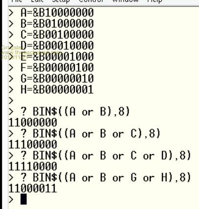 It would seem that what I need is the ? BIN$((A OR B),8) command? So therefore, A OR B should give me the combined result, yes? What if we throw variable C into the mix? Can you have something like ? A OR B OR C? I will experiment some more. Not meaning to start a heated discussion on the best way to do it.