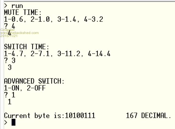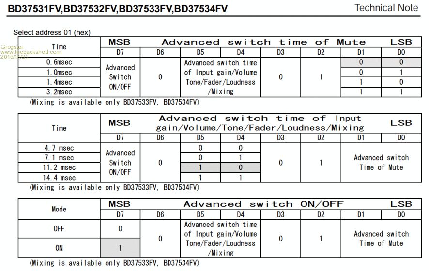 My experimental code: 'Amp-A-Mite 2A (Rohm processor) 'November/December 2015. Const RELAYS=&H57 'Relay control board I2C address '--------------------- 'GENERAL APU CONSTANTS '--------------------- Const APU=&H80 'Audio Processor Unit I2C address(BD37534FV) Const APU_INI1=&H01 'Initial setup byte #1 Const APU_INI2=&H02 'Initial setup byte #2 Const APU_INI3=&H03 'Initial setup byte #3 Const APU_SEL=&H05 'Input selector Const APU_GAIN=&H06 'Input gain Const APU_VOL=&H20 'Volume gain Const APU_LF=&H28 'Left Front fader Const APU_RF=&H29 'Right Front fader Const APU_LR=&H2A 'Left Rear fader Const APU_RR=&H2B 'Right Rear fader Const APU_SW=&H2C 'Subwoofer fader Const APU_BASS=&H41 'Bass control Const APU_MID=&H44 'Middle control Const APU_TREB=&H47 'Treble control Const APU_BG=&H51 'Bass gain Const APU_MG=&H54 'Middle gain Const APU_TG=&H57 'Treble gain Const APU_LG=&H75 'Loudness gain Const APU_RST=&HFE 'APU reset '--------------------- 'APU CONTROL CONSTANTS '--------------------- Const APU_ASM0.6=&H00 'Advanced Switch Time(MUTE) 0.6ms(00 dec) Const APU_ASM1.0=&H01 'Advanced Switch Time(MUTE) 1.0ms(01 dec) Const APU_ASM1.4=&H02 'Advanced Switch Time(MUTE) 1.4ms(02 dec) Const APU_ASM3.2=&H03 'Advanced Switch Time(MUTE) 3.2ms(03 dec) Const APU_ASI4.7=&H00 'Advanced Switch Time(INPUT) 4.7ms(00 dec) Const APU_ASI7.1=&H10 'Advanced Switch Time(INPUT) 7.1ms(16 dec) Const APU_ASI11.2=&H20 'Advanced Switch Time(INPUT) 11.2ms(32 dec) Const APU_ASI14.4=&H30 'Advanced Switch Time(INPUT) 14.4ms(48 dec) Const APU_AS0=&H00 'Advanced Switch off (00 dec) Const APU_AS1=&H80 'Advanced Switch On (128 dec) Start: Print "MUTE TIME:" Print "1-0.6, 2-1.0, 3-1.4, 4-3.2" Input A If A<1 Or A>4 Then GoTo Start Print A Select Case A Case 1 MT=APU_ASM0.6 Case 2 MT=APU_ASM1.0 Case 3 MT=APU_ASM1.4 Case 4 MT=APU_ASM3.2 End Select Print "SWITCH TIME:" Print "1-4.7, 2-7.1, 3-11.2, 4-14.4" Input B If B<1 Or B>4 Then GoTo Start Print B Select Case B Case 1 ST=APU_ASI4.7 Case 2 ST=APU_ASI7.1 Case 3 ST=APU_ASI11.2 Case 4 ST=APU_ASI14.4 End Select Print "ADVANCED SWITCH:" Print "1-ON, 2-OFF" Input C If C<1 Or C>2 Then GoTo Start Print C Select Case C Case 1 ASS=APU_AS1 Case 2 ASS=APU_AS0 End Select Print "Current byte is:"; BITE=(MT Or ST Or ASS)+4 Print Bin$(BITE,8), Str$(BITE)+" DECIMAL." End Done this way, with lots of constants, I can just easily or them together as discussed, and this seems to be working fine for building the data byte. The line that builds BITE, has "+4" on the end, as the data byte always has bit2 set for this command, and that also seems to be giving the correct results.