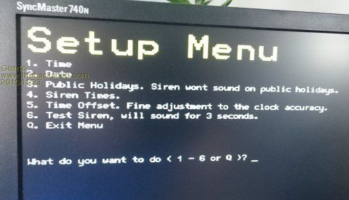 The software is not well written, bit old school, but it works. The main screen displays the time and date. Hitting any key brings up a menu, where you can set the current time and date, time offset, siren times, holidays and a test function. If any of the screens are left open for too long, the watchdog resets the chip and the program restarts.