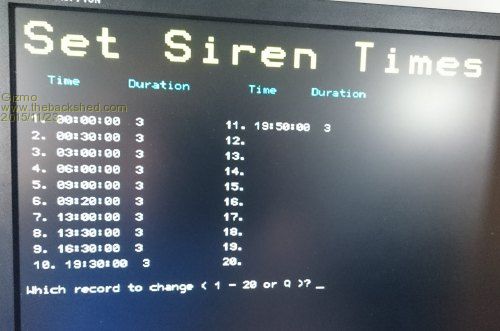 There are 20 siren time slots per day, and you can have different times for different days. The siren duration can be set from 1 to 5 seconds.