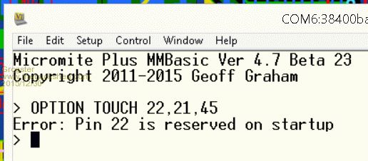 I just tried your OPTION TOUCH 22,21,45 command on my MM PLUS and received a "restart Micromite" response. Mine is at Beta 37, yours is at 23. |
