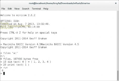 FOR n = 1 TO 4 txt(n) = n NEXT n PRINT TXT( 1 ) TEXT is not a keyword in V4.5 but is used in later versions for the micromite. It would be safer to refrain from using TEXT as a variable name (but does not cause problems for now) You can forget about using line numbers. They still work in V4.5 but it is better to learn to leave them alone, the sooner the better. Seeing a double signon is not a problem, just a quirk of Linux and the USB-serial initialization. Windows users see that sometimes too. Jim VK7JH MMedit |