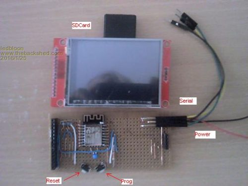 Maybe of some interest to somebody...ILI9341 backpack ESP ESP-12F programmed using Arduino IDE v1.6.7 and the ESP v2.0.0 platform package. The ILI9341 LCD display programmed with Adafruit-ILI9341 & Adafruit-GFX libraries (although I had to make many fixes in the ILI9341 for it to work). Access to the SDCard ok, one test program draws a 24 bit Windows bitmap file from the SDCard. Usual graphics with text, lines, boxes, circles & triangles. Works quite niceley. Another (simple) test program, connect ESP to local LAN, then send commands from PC via telnet to draw text & graphics. Next step, connect to internet to gather info to display... Rgds to all led edit: Picture hasn't shown up. Do I need to store it somewhere and post link? edit2: